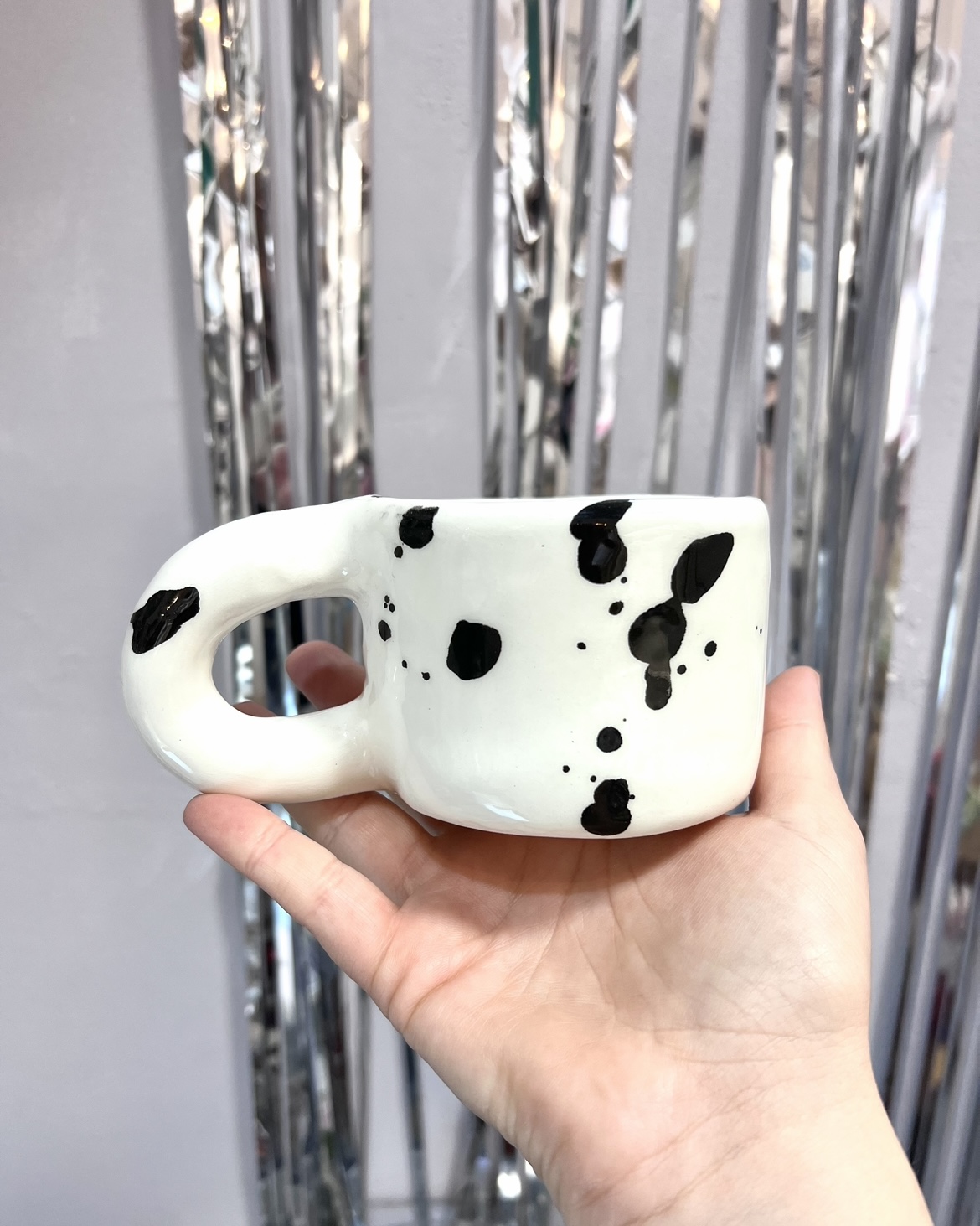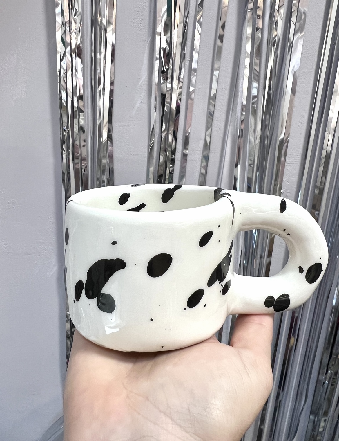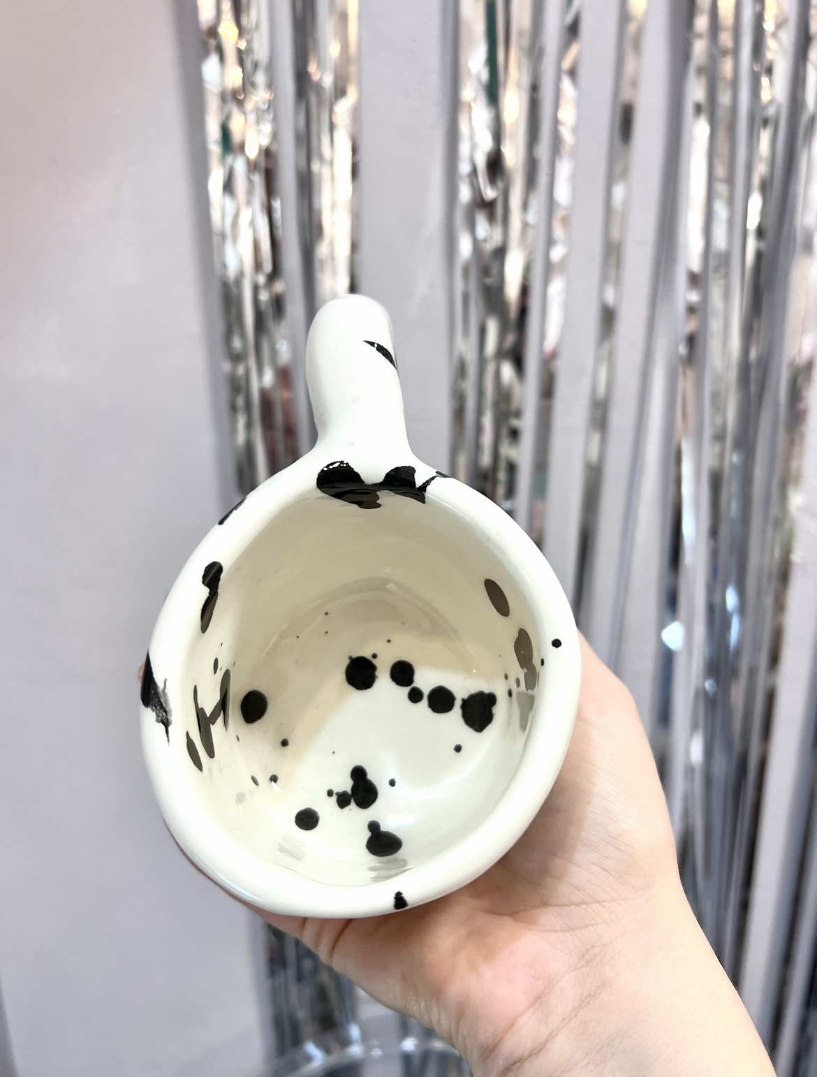 Κεραμική κούπα με μαύρες πιτσιλιές. Ύψος 6.2 cm Μήκος μαζί με χερούλι 13,5 cm