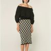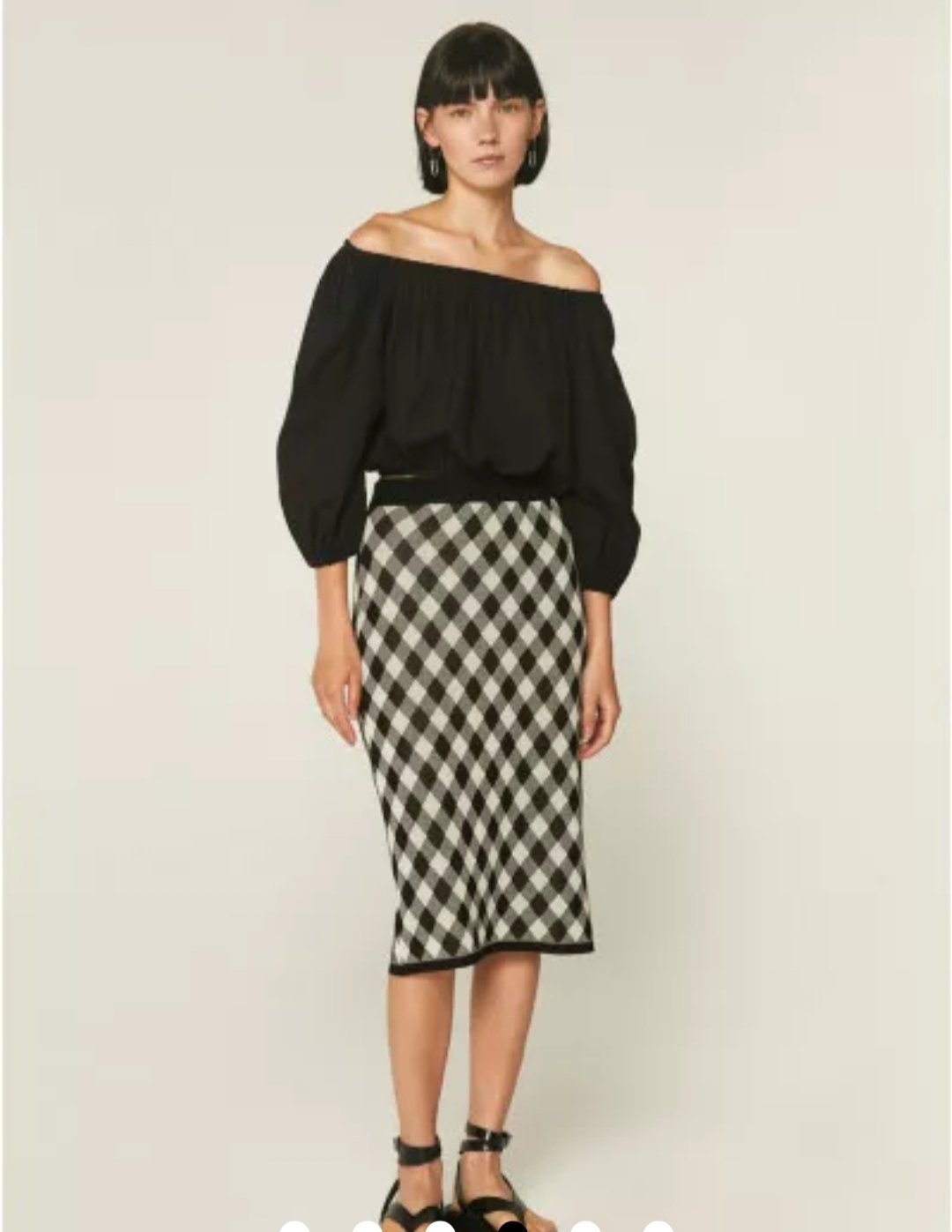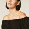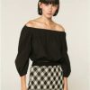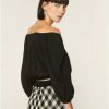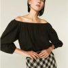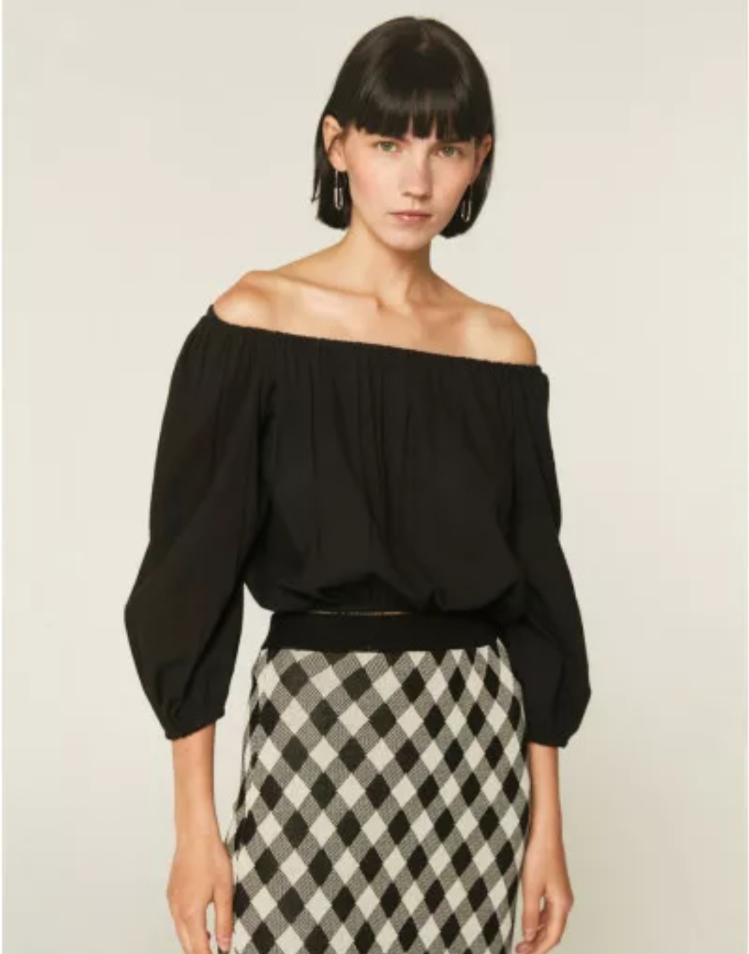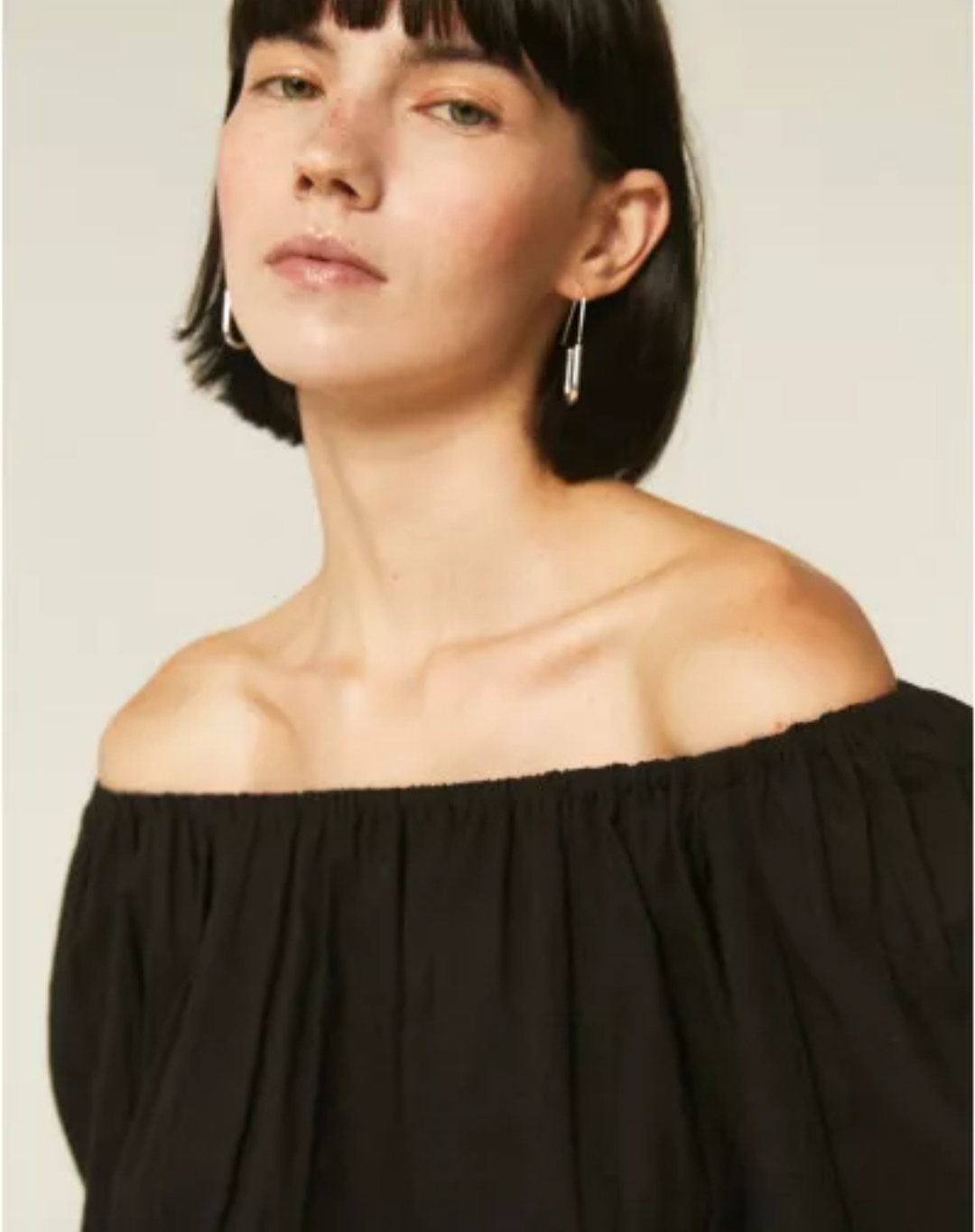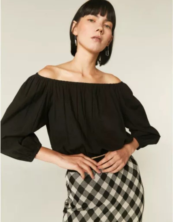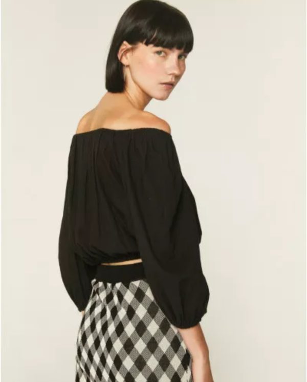 Cotton crop top in black. Off-the-shoulder neckline and three-quarter sleeves. Elastic details. Model wears size S.